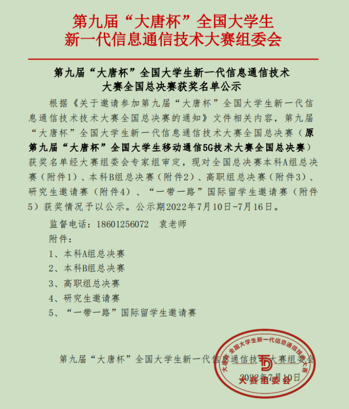中兴通信学院校企联合组成指导教师队伍,指导学院学生参加第九届“大唐杯”全国大学生新一代信息通信技术大赛全国总决赛,获得国赛“三等奖”1项。