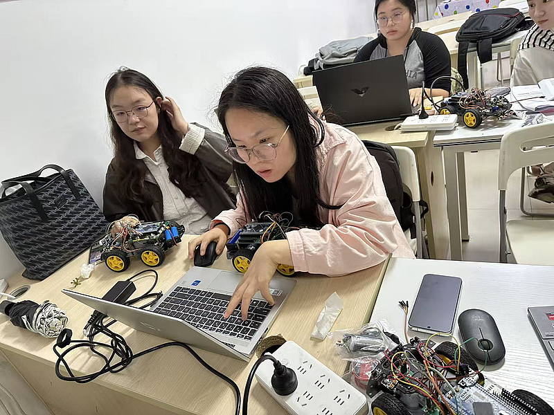 9月21日,培训进入实践应用环节。企业导师以“智能小车电路与功能逻辑”为主题,首先拆解了小车的硬件组成——包括STM32主控板、电机驱动模块、循迹传感器、电源模块等,并详细讲解了各部分的连接逻辑与信号传输原理。“智能小车的核心是‘感知-决策-执行’闭环,循迹功能正是这一逻辑的典型体现。”导师介绍道。
