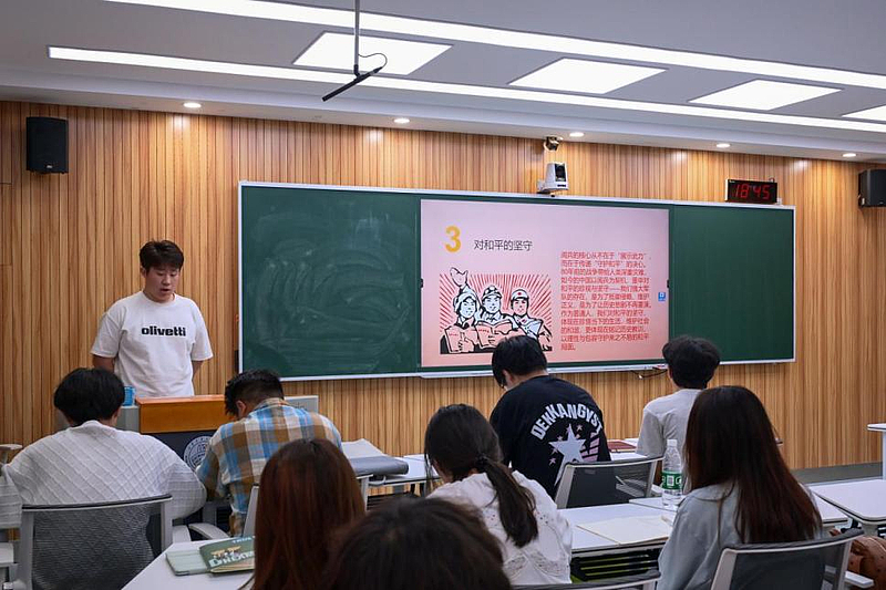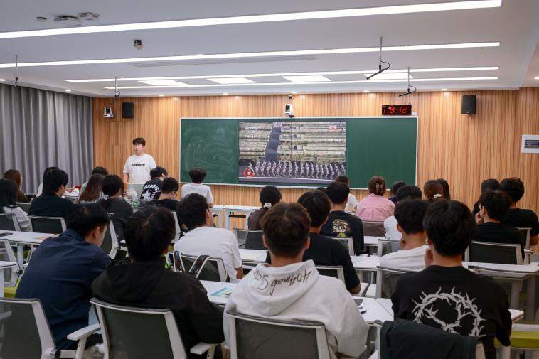 在历史回望的基础上,冯嘉斌同学以 “抗战岁月里的责任与坚守” 为核心展开专题讲解。他没有局限于单一群体,而是通过不同身份者的故事,勾勒出全民抗战的责任群像:“前线战士的责任,是手握钢枪冲锋陷阵,哪怕只剩最后一口气也要守住阵地;后方群众的责任,是省出口粮支援前线,用一针一线缝制棉衣传递温暖;地下工作者的责任,是在黑暗中搜集情报,用生命守护每一条关键信息 —— 他们的‘责任’,无关身份、不分年龄,都是为了守护家国、捍卫和平。” 同时,他结合新时代青年的使命,引导学子思考:“如今我们生活在和平年代,但责任从未缺席 —— 维护国家荣誉、传承红色精神、服务身边群众,这些都是我们青年该扛起来的责任,是对先烈‘责任精神’的延续。” 这番讲解让学子们深受触动,2024 级人工智能专业的张宇轩在笔记本上写道:“以前觉得‘责任’离自己很远,现在才明白,先烈的责任是保家卫国,我们的责任是守护当下的和平、传递向上的力量,这是跨越时空的担当。”