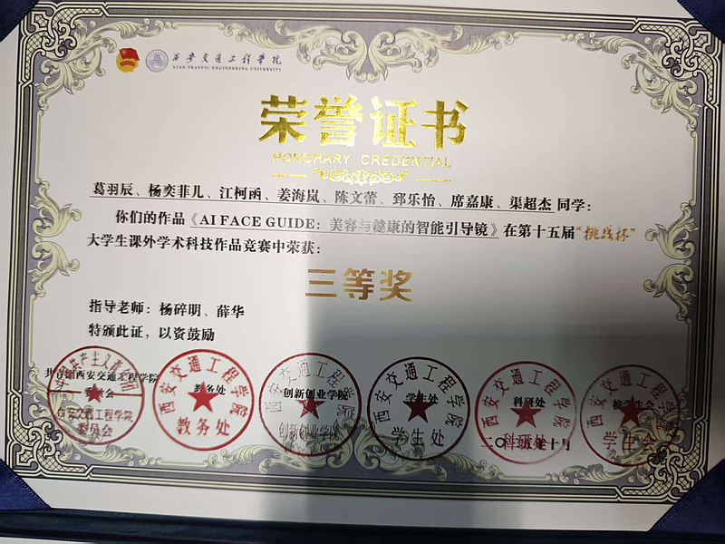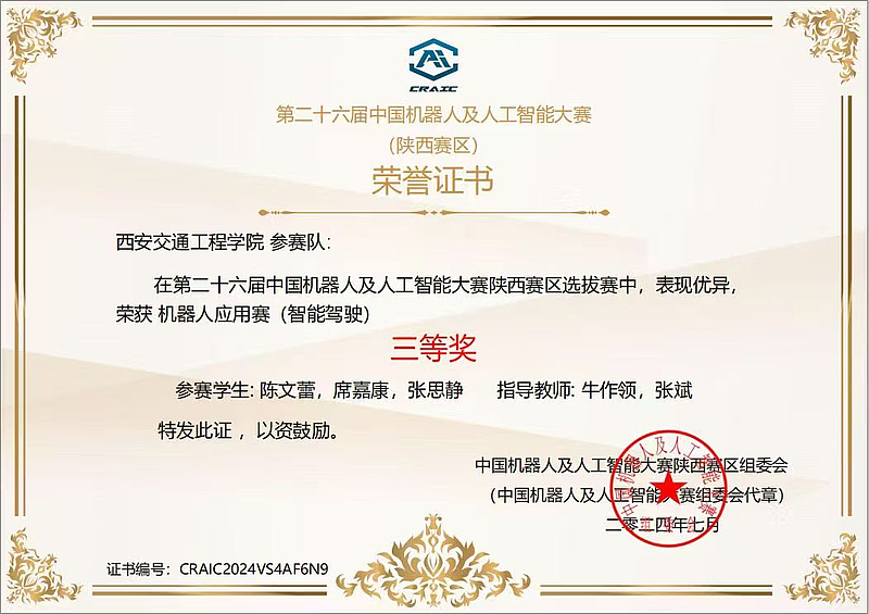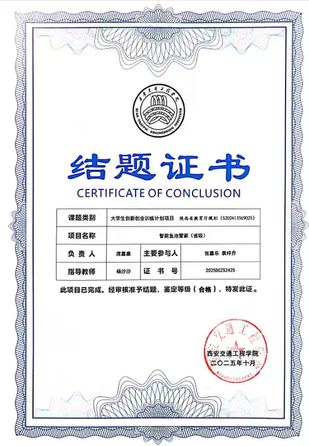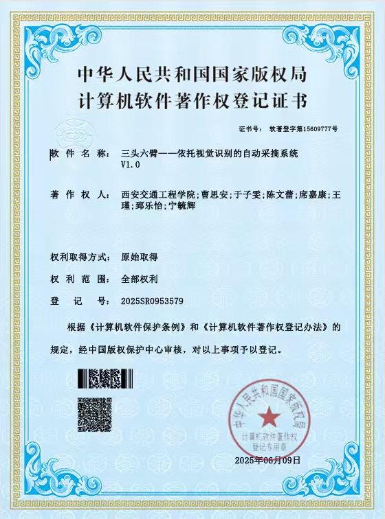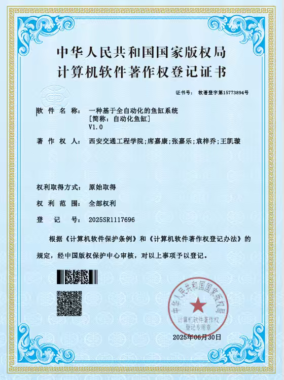 在竞赛方面,我始终秉持“以赛促学、成果转化”理念,我先后斩获中国机器人及人工智能大赛陕西赛区奖项、“挑战杯”校级奖项、中国国际大学生创新大赛陕西赛区奖项等6项荣誉;学术与成果层面,以第一作者身份在《物联网技术》期刊发表智能鱼缸水质监测相关论文,牵头完成“自动采摘系统”“自动化鱼缸”2项软件著作权登记,主持的大学生创新创业训练计划项目顺利结题,将课堂知识转化为可落地的技术成果。我也从中明白了:科创的价值在于“学用相长”,成长的关键在于“深耕不辍”。竞赛中的攻坚克难,不仅是荣誉的积累,更是锤炼解决问题能力的过程;学术研究与成果转化,让我跳出课本局限,懂得将理论知识转化为实用价值才是学习的终极目标。每一次项目调试、每一篇论文撰写、每一项专利申请,都让我坚信,唯有以专注扎根专业,以实干破解难题,才能在科创道路上收获真正的成长与突破。