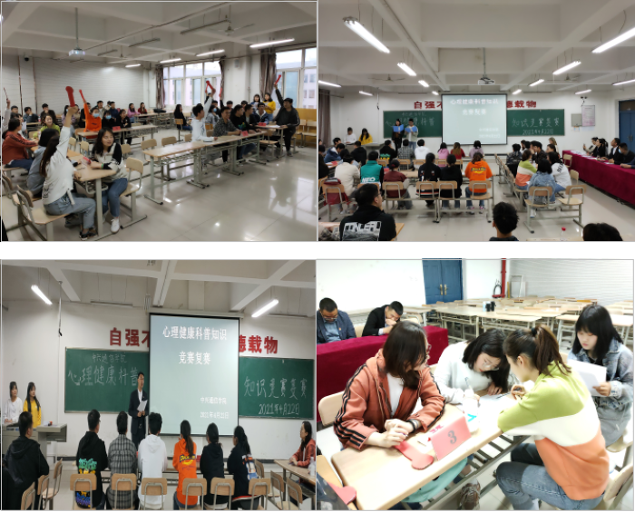 心理健康教育是大学生生涯中的重要课程,它关乎着“全人”的发展,适合新时代高校对大学生核心素养形成的追求。为积极响应“陕西高校第六届阳光护航、心理育人”宣传实践活动,加快我院大学生心理健康教育活动的落实推广,同时为掌握学生心理素养基础,在学生中全力推广普及心理知识。中兴通信学院于2021年4月22日晚18:30在崇德楼2-502教室举办心理知识竞赛(复赛),党总支书记张斌、辅导员聂林红、吴璇现场观赛并担任评委,本次比赛由张晨兴、张瑞龙同学主持。