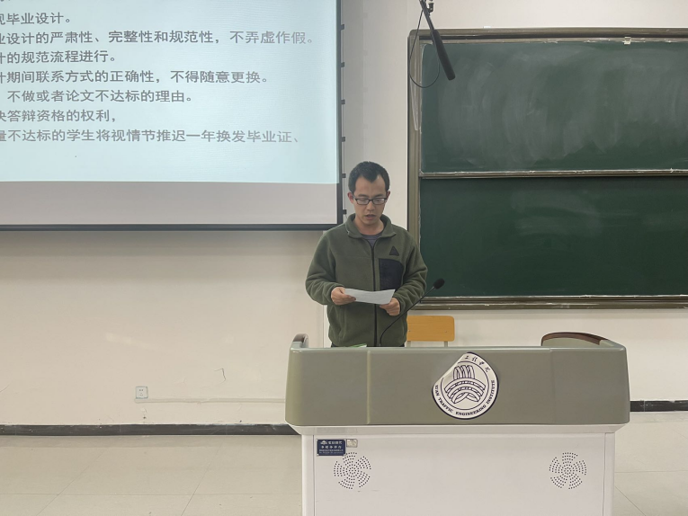 接着,副院长牛作领对学院毕业设计系统流程进行了全面系统的介绍,包括拟题、任务书、开题报告、中期检查、论文初稿等环节的指导细节内容,特别提醒了拟题审批表中有关于项目内容跟往年不同的部分,以及目前的指导工作安排。他强调指导老师必须对学生毕业论文的意识形态做正确引导,及时指出学生毕业论文的选题及理论选择问题避免出现重大错误,对于老旧理论的使用必须要持有思辨的过程。