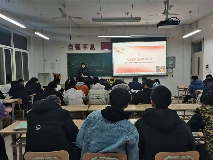 ——举行“宪法在心中”主题班会。本次班会活动,结合校情和学生的生活实际开展主题教育。为增强教育效果,各班利用多媒体设备制作了相关课件。通过此次法治教育主题班会增进了同学们对于宪法的认知与理解、学会使用宪法去维护自己的权益,保护自己,并激励同学们积极加入宪法知识宣传,努力做一名尊法守法的大学生。