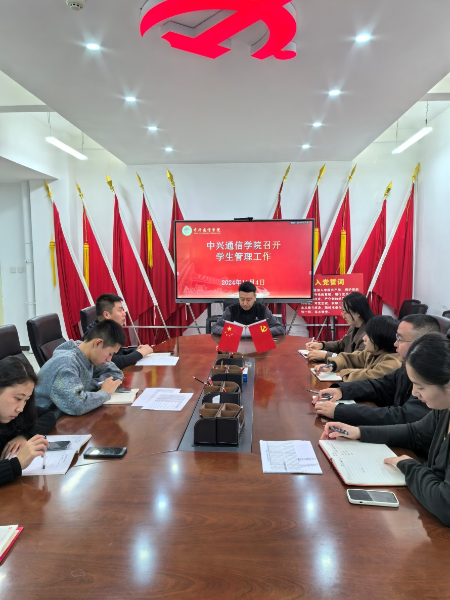 2024年11月4日,中兴通信学院于学院会议室召开学生管理会议,旨在进一步加强学院学生管理工作,提升育人成效。学院党委书记张斌出席会议并发表重要讲话,全体辅导员参会。