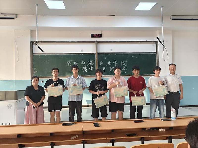 随后,党委书记张雯雯宣布翔腾班正式开班。她表示,翔腾班的成立是学院响应国家集成电路产业发展战略、深化校企合作的重要举措,培养具备扎实技术能力与行业视野的高素质人才。张书记寄语全体学员,希望他们以“探索、求真、协作”为学习准则,在专业领域深耕细作,为未来集成电路产业的自主突破贡献力量。仪式现场,张雯雯书记为翔腾班学生逐一颁发定制学习用品套装。