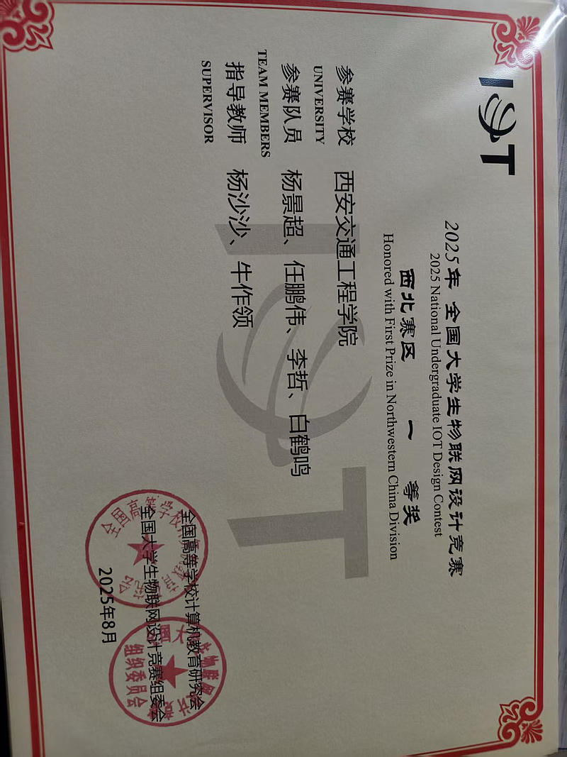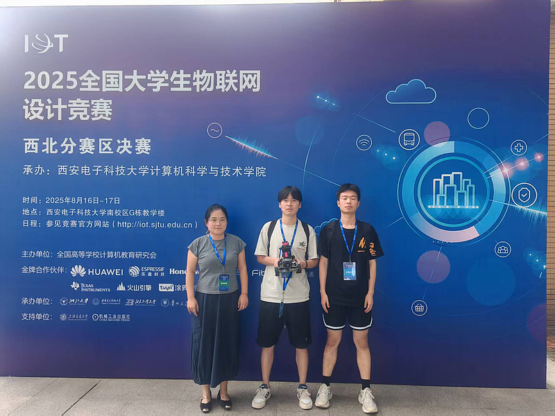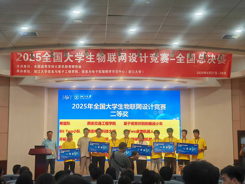 2025年8月27日-2025年8月29日,2025年全国大学生物联网设计竞赛在浙江大学举办,在指导老师为杨沙沙和牛作领带领下,我校1946伟德国际源自英国物联网工程专业杨景超、任鹏伟、李哲、白鹤鸣的希望队凭借项目“基于视觉识别的搬运小车”,在众多参赛队伍中脱颖而出,斩获全国总决赛二等奖。