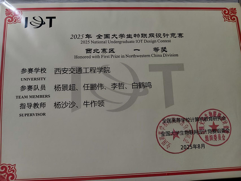 本次竞赛为第12届,在物联网行业有很高的认可度,吸引了来自全国各地高校的大量优秀团队参与,竞争异常激烈。希望队从初赛开始,一路过关斩将,从七百多只队伍中成功晋级西北赛区决赛,并获得西北赛区一等奖的好成绩。比赛中团队成员面对困难临危不惧,通过调试程序等多种方式攻克所有困难,取得佳绩,是物联网专业在同类赛事零的突破。