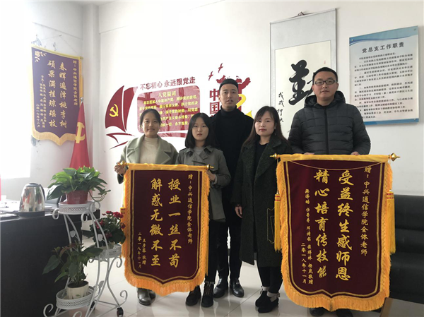 12月3日上午,中兴通信学院国家励志奖学金获得者王彦蓉同学为感谢中兴通信学院的关爱和培养,特向学院赠予锦旗。中兴通信学院党总支书记张斌、辅导员贾晶、郭锦亮共同接过写有“授业一丝不苟,解惑无微不至”的锦旗时,被该同学的感恩之心感动,并表示感谢。