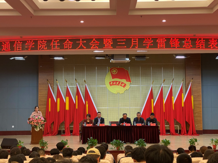 为树立典型,进一步推动各项工作的加快发展。4月16晚,中兴通信学院学生干部任命大会暨学雷锋月总结表彰仪式在学术报告厅召开。学校党委委员、副校长王勇、校团委副书记王小英、中兴通信学院党总支书记张斌、中兴通信学院副院长牛作领、中兴通信学院学管秘书王顺以及分院师生代表共计600余人参加会议。会议团总支书记贾晶主持。
