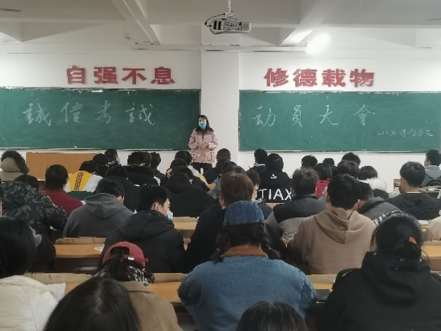 结合传统美德,进行诚信考试宣讲。为进一步维持良好的考风考纪,营造公平公正、诚实守信的考试氛围,加强学院学风建设,该院于12月16日晚开展诚信考试动员大会。团总支书记贾晶从考试的性质和作用,考试作弊带来的严重后果等几个方面阐释了诚信考试的重要性,针对部分考生的作弊心理做了深入剖析,并对考试违纪处分条例进行了解读,明确了考试红线。本次诚信考试动员大会的召开,为该院加强考风建设、严肃考纪、营造良好的考试氛围打下了坚实的基础。