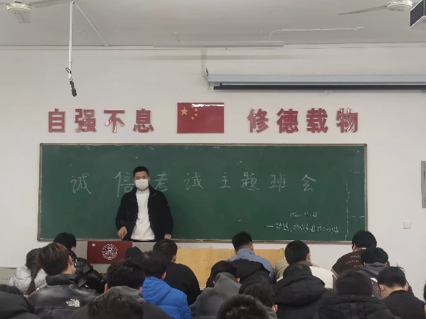 召开主题班会,助力诚信考试。各班级围绕诚信考试召开主题班会,辅导员带领各班同学认真学习《学生手册》中关于学生考试纪律和违纪认定处理办法、大学生违纪处分规定等内容,帮助同学们从思想上认识到诚信考试的重要性和必要性,希望大家能够严格遵守考试纪律,诚信考试,依靠自己的努力学习取得优异成绩。主题班会中,全体学生签署了诚信考试承诺书。