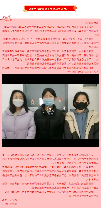 疫情防控,人人有责,中兴通信学院全体师生将坚持高度重视此项工作,从自身做起,积极配合学校安排,打赢这场疫情防控阻击战。