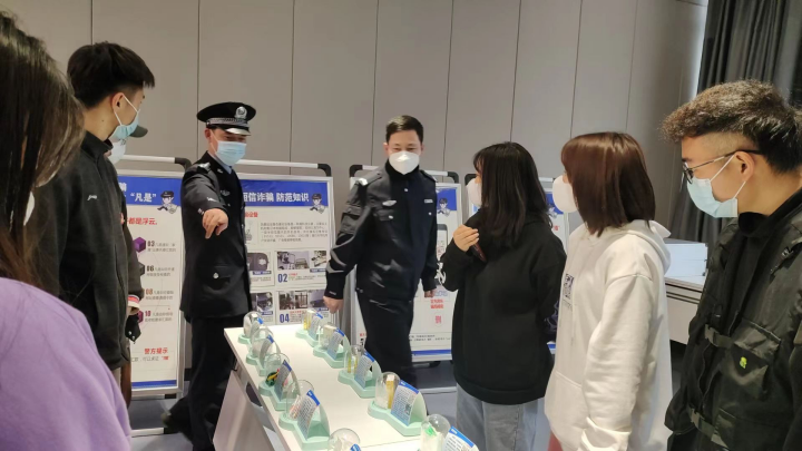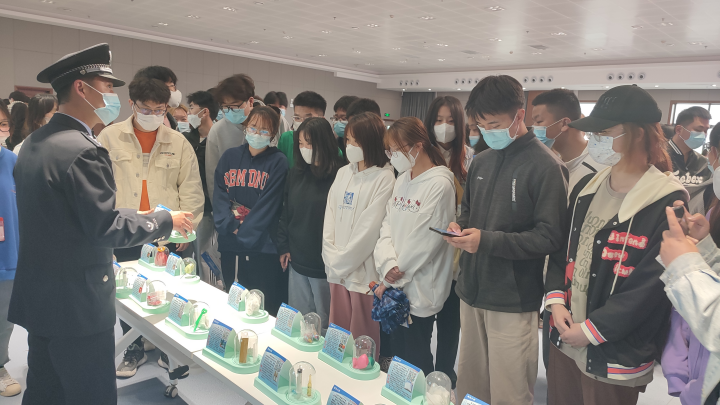 首先,贾晶老师做会前发言,她指出,本次讲座由派出所民警亲自讲授,专业性强,有利于提高广大师生的安全防范意识,培养良好的安全行为习惯,确保学校持续安全稳定,希望在座同学认真学习,做好记录,传达讲座精神。其次,代警官主要向大家讲述了网络安全方面的知识,他结合自身多年的工作经验,以学校常见的电信诈骗案件出发,他指出,电信诈骗的特点可概括为:远、外、繁、深,并就高校大学生如何预防违法犯罪、如何运用法律手段自我保护进行深入讲解,给同学们上了一节生动的安全教育课。杨警官主要为同学们讲述了禁毒方面的知识。通过一段视频向大家介绍了罂粟、吗啡、冰毒、大麻、海洛因等几种常见的毒品,随后告诫大家一定要远离毒品,否则就会造成一旦吸毒、终生难戒的严重后果,这对同学们的身体和精神都会造成极大的摧残。最后,杨警官带领大家一起参观学习了几种常见的毒品样品,并提醒同学们在平时的生活中,要拥有辨别毒品的能力,严守法律底线,学会保护自身安全。
