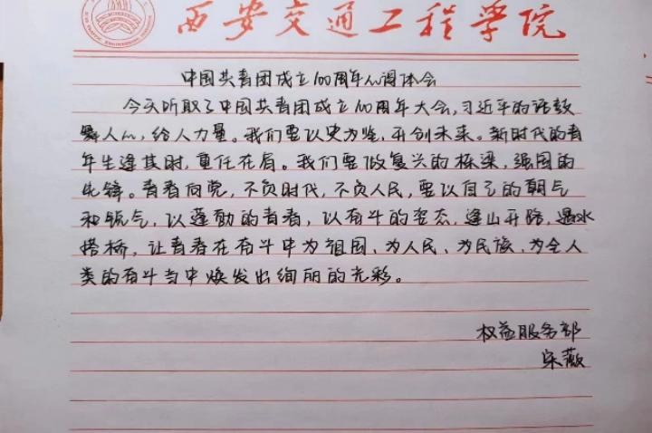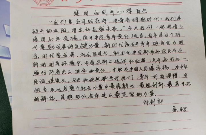 “我们是五月的花海,用青春拥抱时代;我们是初升的太阳,用生命点燃未来。”今天我们一起观看了建团100年直播,学习中国青年责任担当。青年是这个时代蓬勃发展的关键力量,新时代离不开青年的责任与担当。时代要发展,社会要进步,新时代中国新青年成长在全新的时空环境中,有着全新的挑成和机遇,只有知行合一,履行所肩负的使命和责任,才能为中国人民谋幸福,为中华民族谋复兴。历史和现实都告诉我们,青年一代有理想,有担当,永远是整个社会力量中最朝气,最能创新,最善开拓的群体,是推动社会前进的最重要的力量。