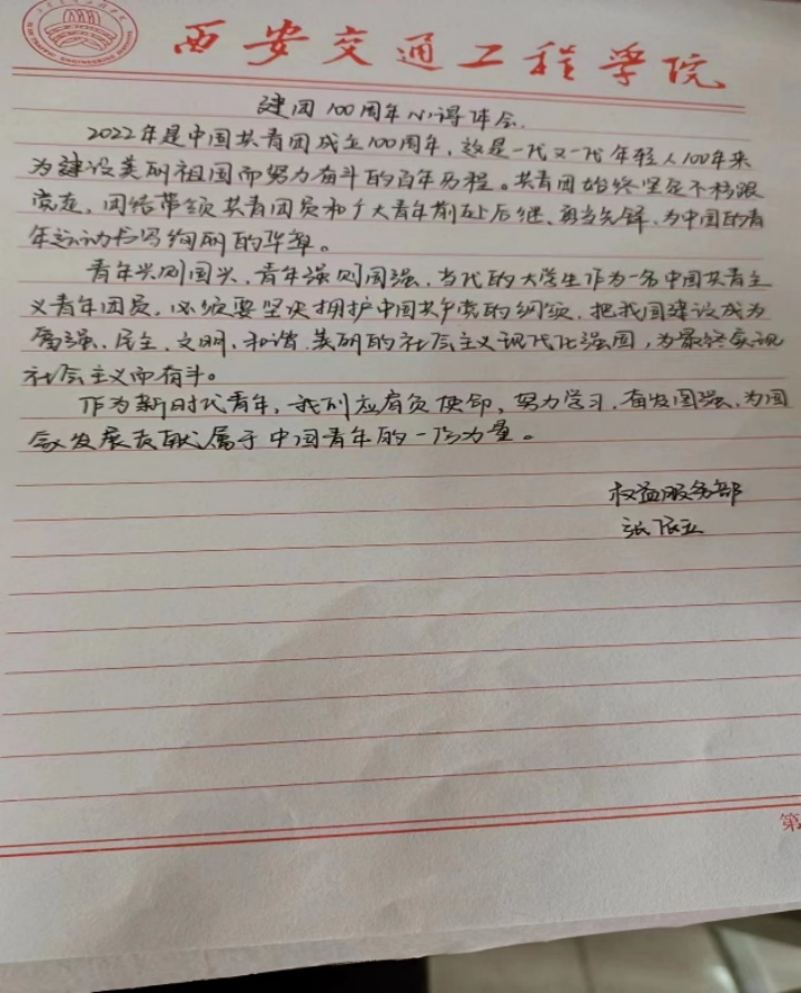2022年是中国共青团成立100周年,这是一代又一代年轻人100年来为建设美丽祖国而努力奋斗的百年历程。共青团始终坚定不移跟党走,团结带领共青团员和广大青年前赴后继、勇当先锋、为中国的青年运动书写绚丽的华章。青年兴则国兴,青年强则国强,当代的大学生作为一名中国共产主义青年团员,必须要坚决拥护中国共产党的纲须,把我国建设成为富强、民主、文明,和谐、美丽的社会主义现代化强国,为最终实现社会主义而有斗。作为新时代青年,我到应肩负使命,努力学习,奋发图强,为国家发展责献属于中国青年的一力量。