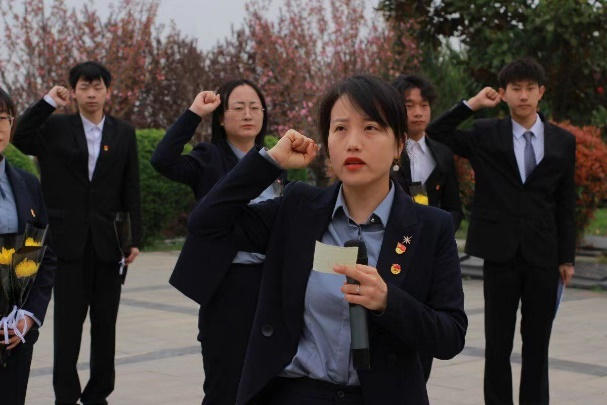 随后,团总支书记贾晶带领团员青年重温入团誓词,他们高举右拳,庄严宣誓,誓言铿锵有力,展现了他们为共产主义事业奋斗的决心。国护队向烈士敬献花圈,团员青年献上鲜花,寄托对先烈的无尽怀念和崇高敬意。