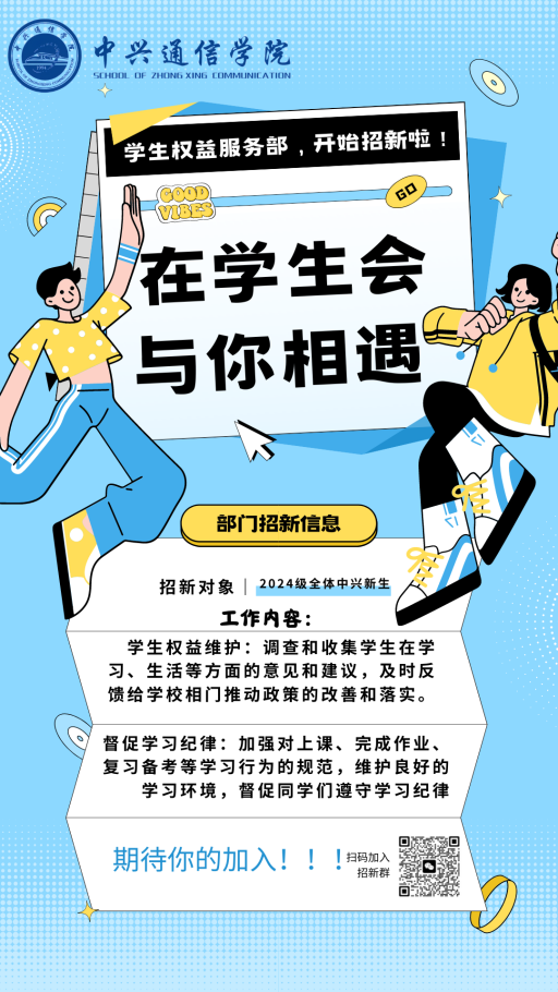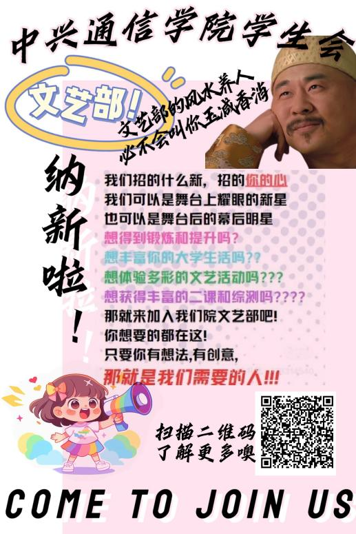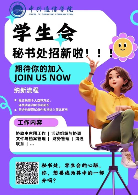 又到一年一度的学生会纳新季节!中兴通信学院学生会诚挚欢迎对学生事务、校园活动充满热情的你加入我们这个大家庭!无论你是想锻炼自己的能力,还是希望为校园贡献一份力量,学生会都是你实现梦想的舞台。