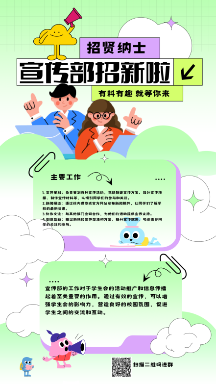 负责学生会活动的宣传与推广,利用多种媒体及时传递信息,增强活动的影响力。