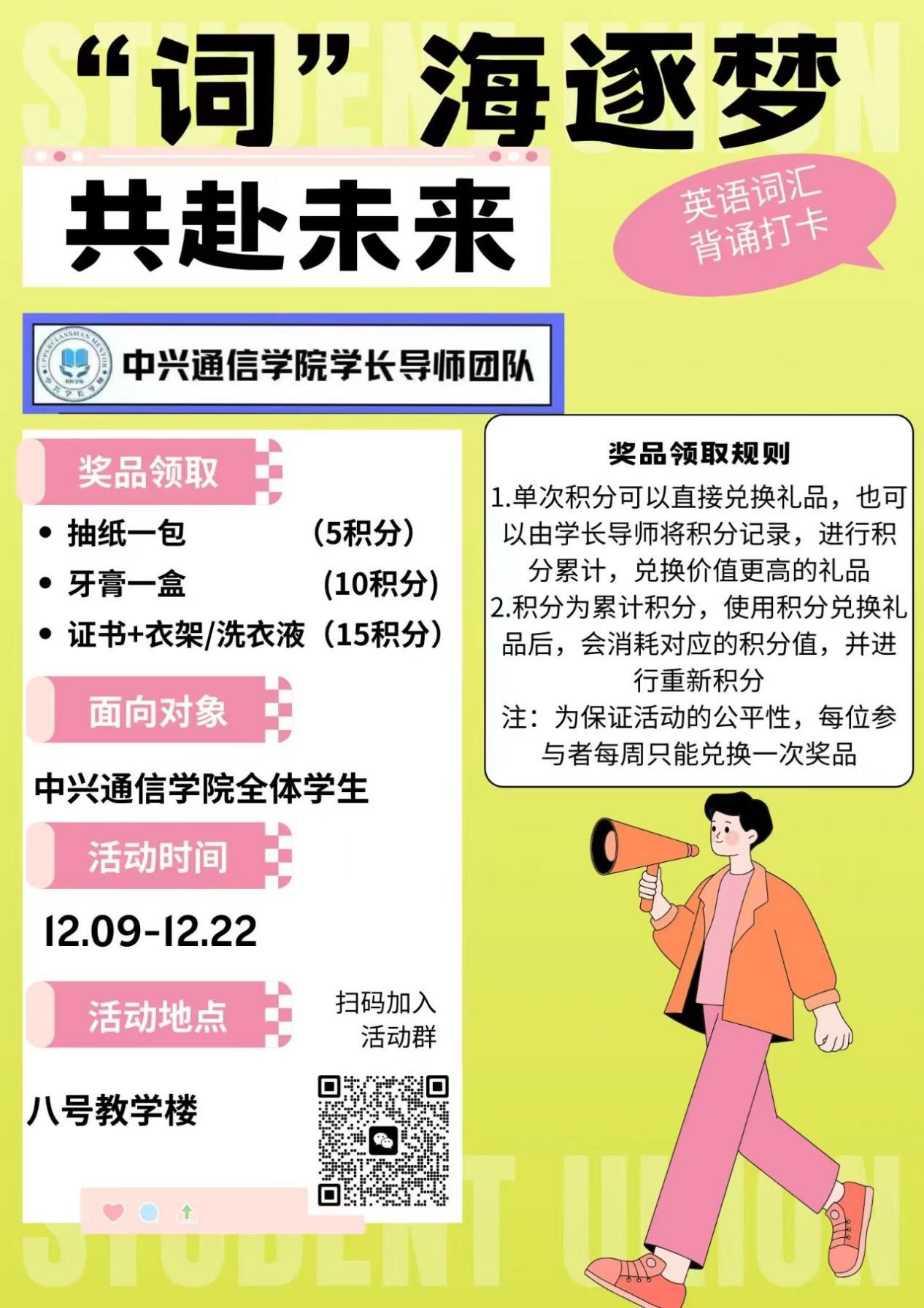 英语是我们现代大学生的必备技能,英语四级水平也是我校的毕业条件之一。英语四级考试在即,为提高我校学生英语水平,中兴通信学院学长导师团队举办“词”海逐梦,共赴未来活动。通过此活动,激励同学们认真背单词,努力备考。