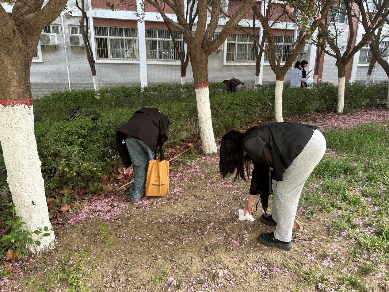 由于道路两旁树木较多,春季风一吹,落叶堆积。同学们沿着道路,从路的一端开始,一步一步向前清扫,不放过任何一个角落。对于一些被风吹到草丛里的垃圾,大家也不怕麻烦,弯下身子,用手将其一一捡出。在大家的努力下,原本满是落叶的道路变得干净整洁,焕然一新。