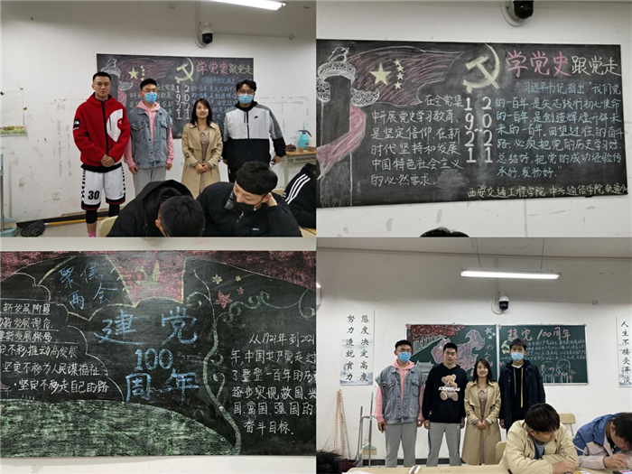 ——举办主题黑板报展。为喜迎中国共产党成立100周年,进一步教育和引导广大师生牢记党的光辉历史,该院组织各班绘制以“学党史 跟党走”为主题的黑板报。同学们运用多种形式作为设计背景,加上丰富的党史知识创作出一幅幅色彩缤纷、布局合理的黑板报,生动描述了中国共产党奋斗史、发展史,让同学们加深了对中国共产党的奋斗历程了解,进一步激励了该院广大学生坚定理想信念、勤奋学习,增强对党、对祖国、对人民的感情,激发了同学们的民族自豪感。