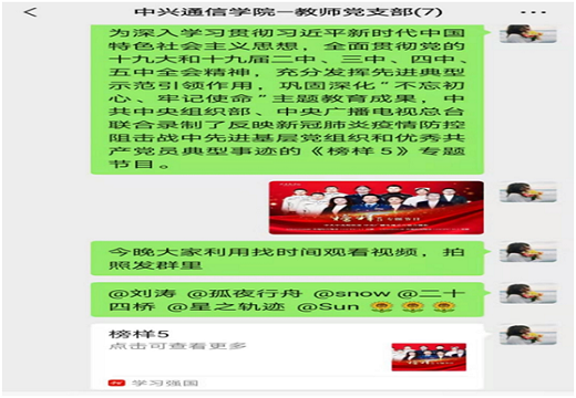 为深入学习贯彻习近平新时代中国特色社会主义思想,全面贯彻党的十九大和十九届二中、三中、四中、五中全会精神,充分发挥先进典型示范引领作用,巩固深化“不忘初心、牢记使命”主题教育成果,根据中组部办公厅印发的《通知》精神要求,该院教师党支部组织教师党员观看《榜样5》这一节目,并开展研讨交流。