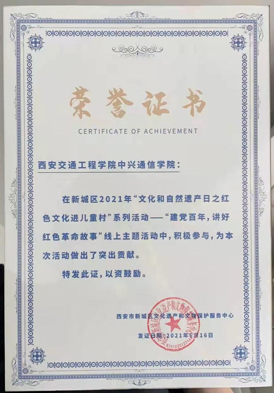 为贯彻习近平总书记在《用好红色资源,传承好红色基因,把红色江山世世代代传下去》中做出的“要加强革命传统教育、爱国主义教育、青少年思想道德教育,把红色基因传承好,确保红色江山永不变色”的重要指示。西安市新城区举办了新城区2021年“文化和自然遗产日之红色文化进儿童村”系列活动。中兴通信学院积极响应,荣获杰出贡献奖。