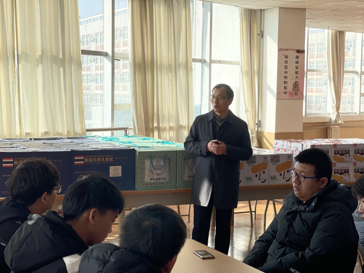 活动中,李乃乾院长发表了简短的讲话,代表学院领导和老师向考研学生表示关怀与慰问。李院长说,我校始终高度重视考研工作,把考研工作作为我校“一流学生”培养的重要方面,努力营造良好的考研氛围,认真做好考研学生学习、生活等方面的服务保障工作。他对考研同学在学风建设中发挥的积极引领作用表示感谢,希望大家调整好心态,查漏补缺,做好最后的准备,预祝同学们取得好成绩。他祝愿同学们“一切真心不被辜负,一切努力终有收获。”图书馆馆长张永清、张斌书记一行也与同学们进行了亲切的交流,送上了最真挚的鼓励与祝福“成功上岸”。随后,学院领导亲自给考研同学们分发考研加油礼物,礼物除了有零食,牛奶,还有学院学管团队亲手准备的抱枕、棉被。