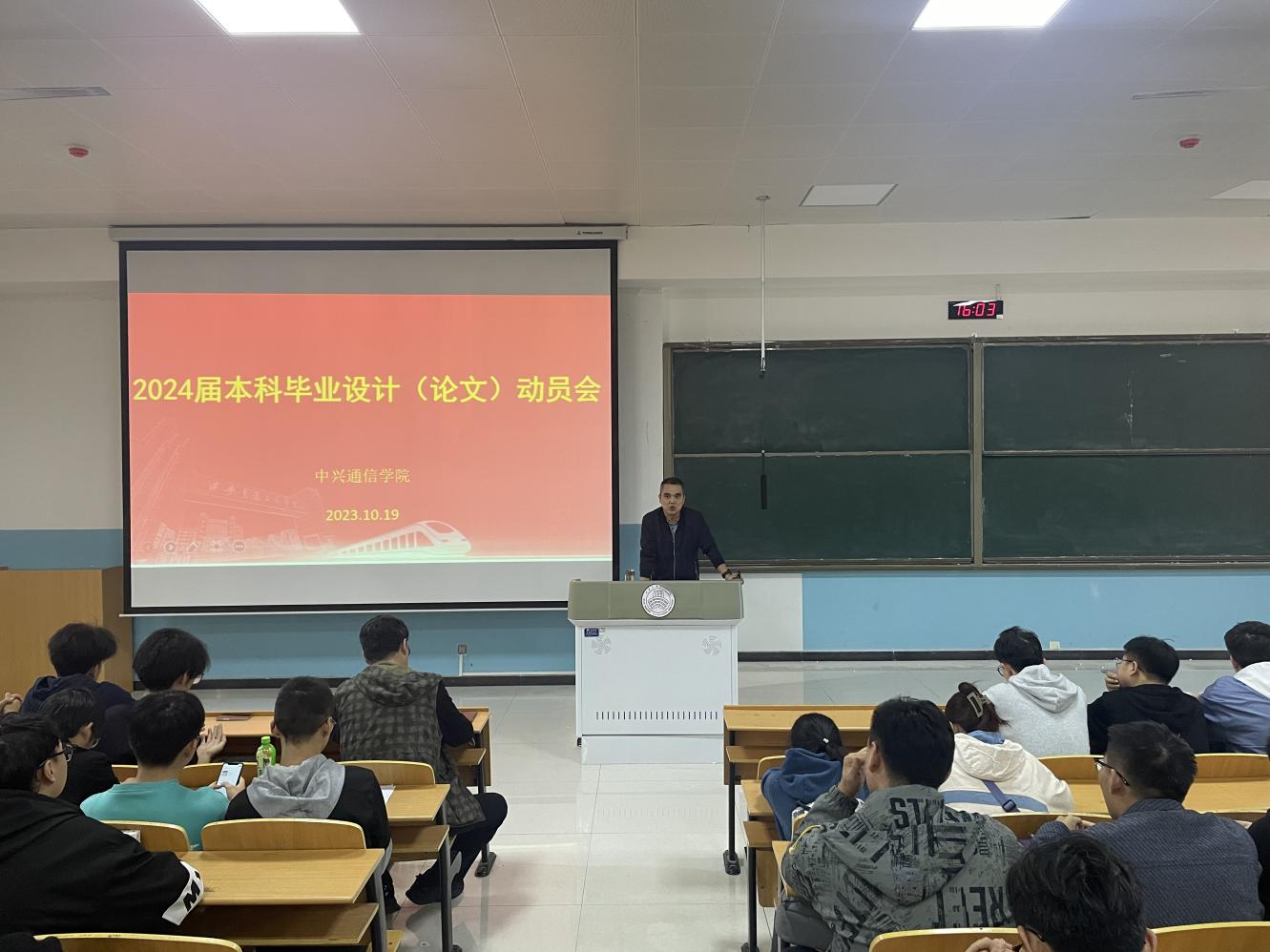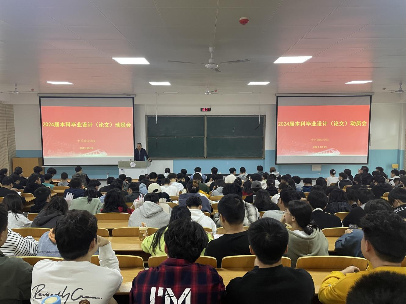 为保障本科毕业设计的顺利开展,不断提高本科毕业设计(论文)质量,10月19日,中兴通信学院于8-201教学楼召开了2024届本科毕业设计(论文)动员大会,该学院院长李乃乾、各教研室主任、毕业班辅导员以及全体2020级毕业生参加会议。会议由副院长牛作领主持。