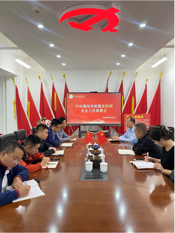 2024 年 9 月 29 日,中兴通信学院在我院会议室召开国庆节假期安全部署工作大会。我院院长李乃乾、党委书记张斌、副院长牛作领、副院长王冠军、学管秘书王鹏以及全体辅导员参加了此次会议。