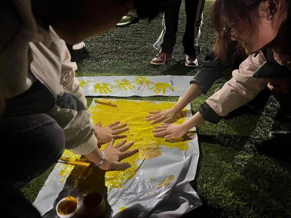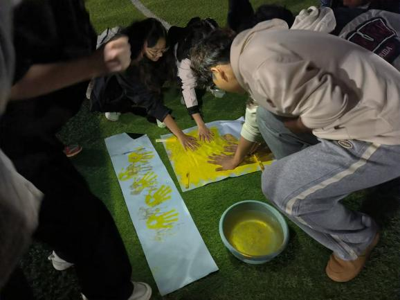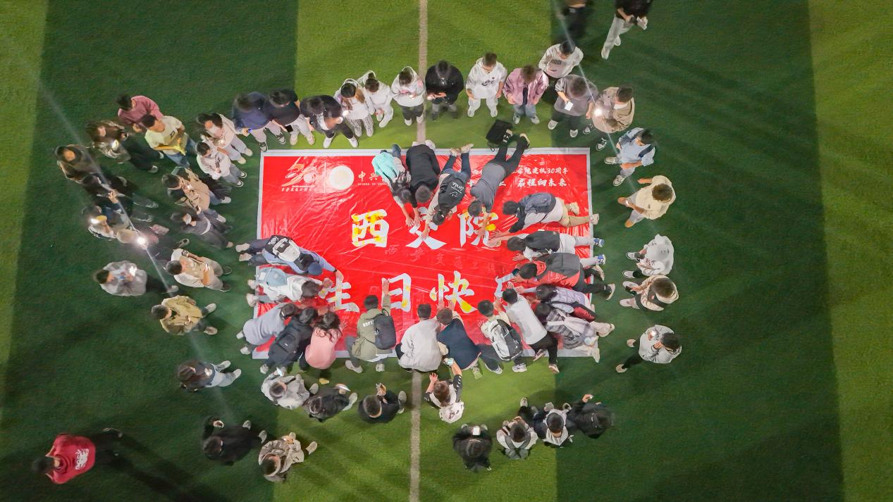 活动现场布置得热烈而富有特色。操场中心,巨幅喷绘上清晰可见“西交院生日快乐”的字样,同学们佩戴着30周年纪念徽章,脸上洋溢着喜悦的笑容。随着活动的开始,同学们纷纷在喷绘上留下自己的手印,象征着彼此心手相连,共同分享这一特殊的时刻。这些手印不仅是个人的印记,更代表着对母校的承诺与热爱。
