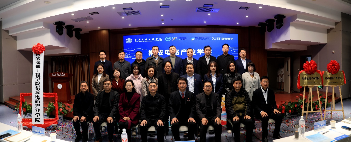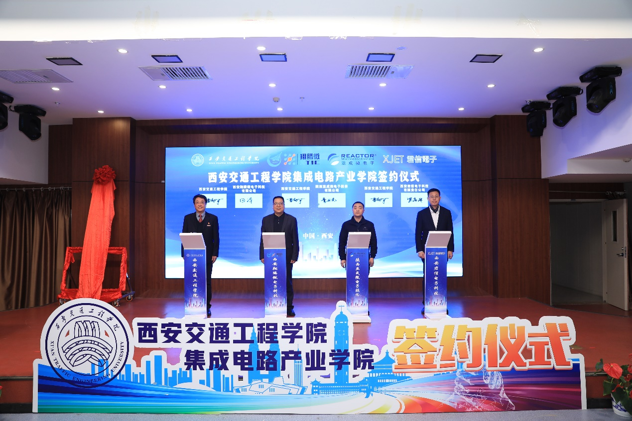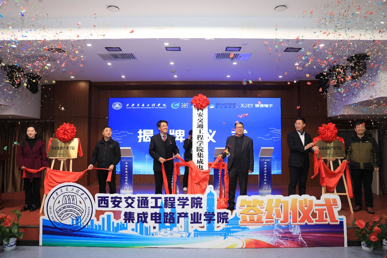 仪式中,学校与西安翔腾微电子科技有限公司、陕西亚成微电子股份有限公司、西安君信电子科技有限责任公司签订校企合作协议。随后,校企合作双方共同为产业学院揭牌并合影留念。