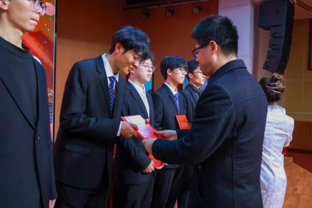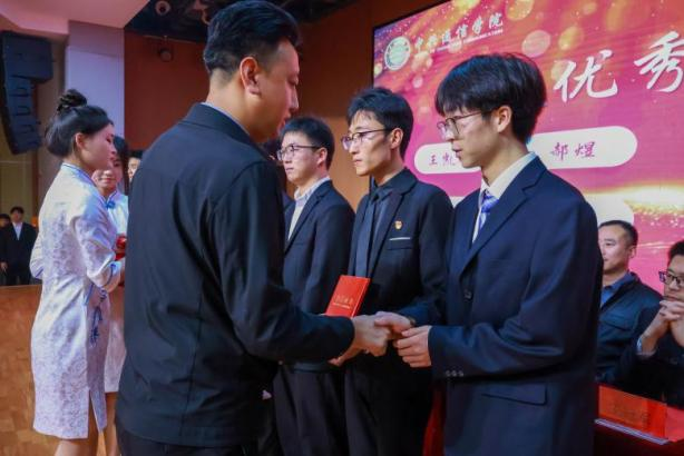 在热烈的掌声中,获奖学生依次上台领奖,出席会议的领导们亲自为他们颁发荣誉证书并鼓励他们再接再厉。中兴通信学院团总支学生会、学长导师新一届学生干部上台与全院师生见面,由李乃乾院长亲自为他们颁发聘书,张斌书记为干部们佩戴工牌。