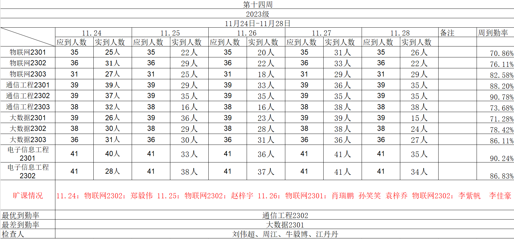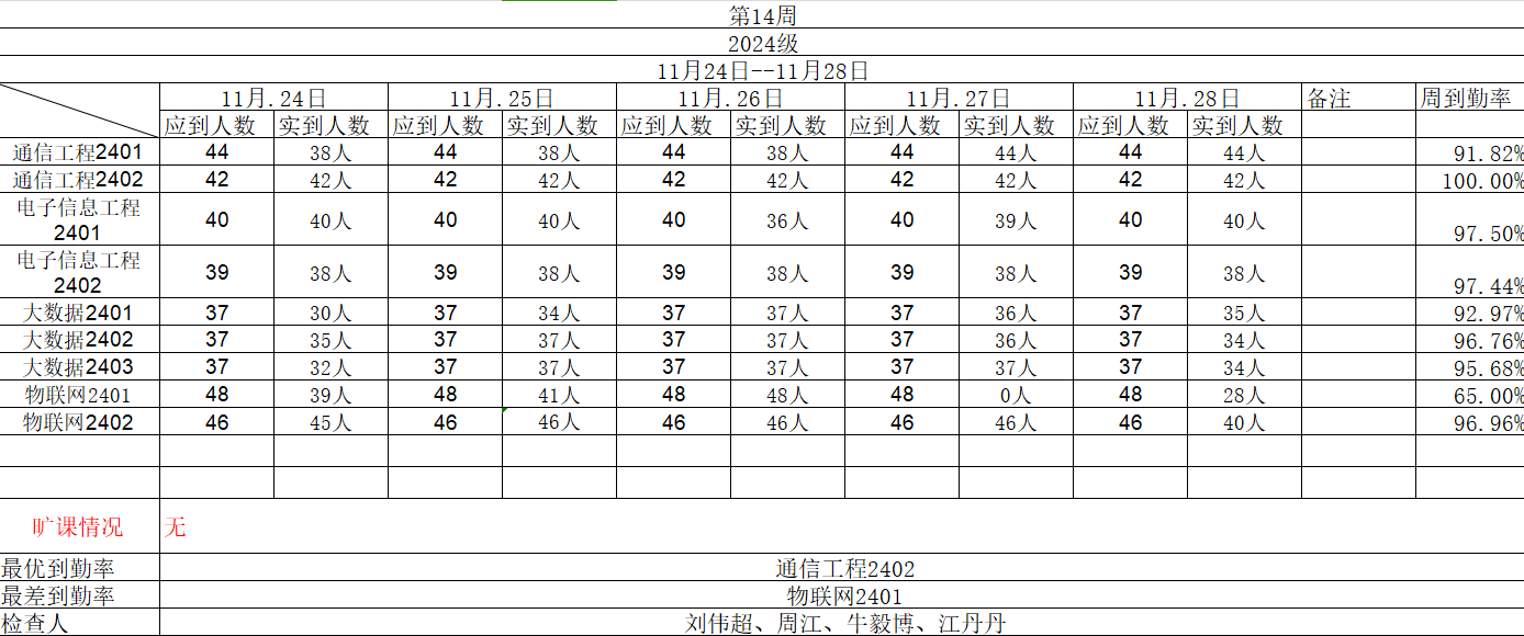 现将中兴通信学院第十四周各班晚自习检查名单公布如下: