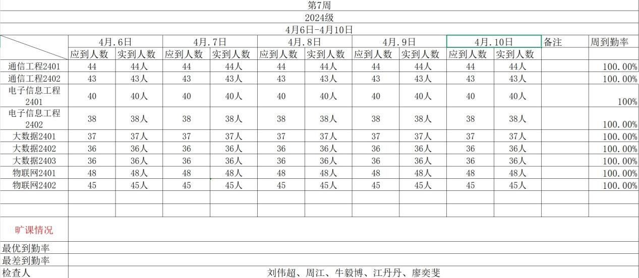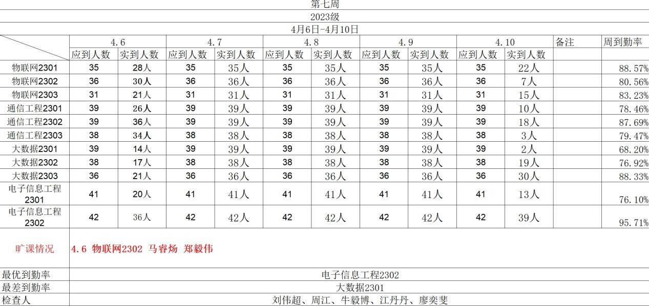 为进一步强化学习管理,营造优良学风,在刚刚过去的第七周,学院学生会与各班班委紧密协作,共同组建了晚自习督查小组。督查小组秉持着严谨负责的态度,针对第七周晚自习期间各班级的出勤状况以及纪律表现,展开了全面且细致的专项检查。现将第七周晚自习查班表公示如下