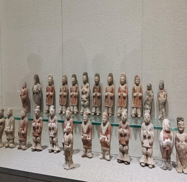 “丝路文明”展区的骆驼陶俑、胡人俑独具风情。骆驼昂首,胡人神态各异,是丝路商贸交融的见证。听着讲解员的讲述,队员驻足凝视,似闻驼铃悠远,浮现出商队穿梭的繁盛画面。