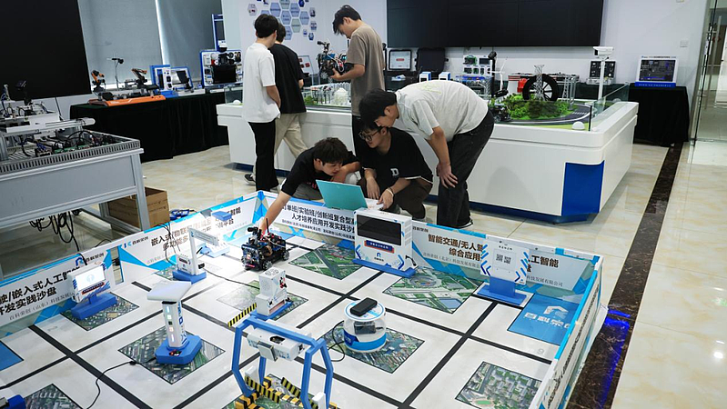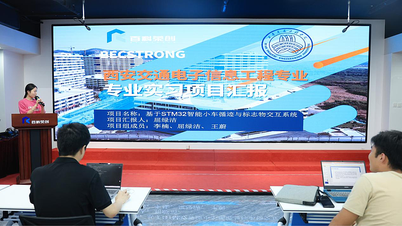 在为期十天的核心实习阶段,学生们以小组形式开展项目实战,从前期的方案构思,中期的硬件组装、电路搭建和程序调试,到最后的测试功能,在工程师的指导下成功实现了智能小车循迹、语音识别及图像识别等多项功能。同时,学生借助企业特色的沙盘教学场地,深度融合前沿技术与行业场景,不断提升工程实践能力、创新思维与解决复杂问题的综合素质,为成为新工科人才打下坚实基础。通过从理论到实践的完整流程训练,同学们不仅巩固了专业知识,更显著增强了解决实际问题的能力和团队协作意识。