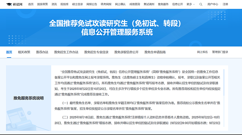 已获推免资格的考生(含在部队服役期间获得三等战功、二等功以上奖励或者二级以上表彰,符合全国硕士研究生招生考试报考条件的退役人员等其他符合免初试资格的考生),须在规定时间内登录 “全国推荐免试攻读研究生(免初试、转段)信息公开暨管理服务系统” (网址:https://yz.chsi.com.cn/tm)填报志愿并参加复试。