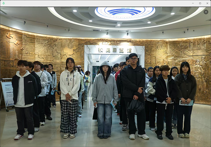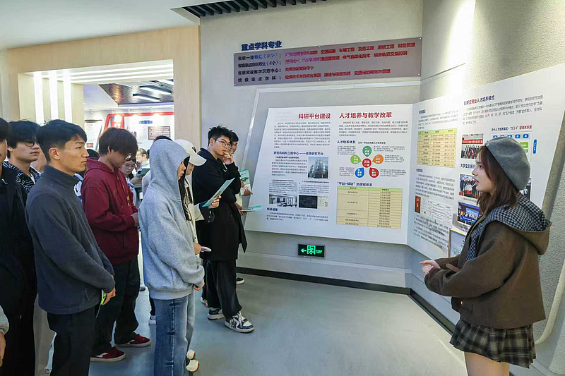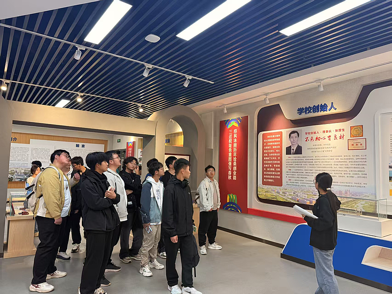 参观过程中,新生们积极与讲解员互动,询问校史中的关键节点与特色发展故事。在讲解员的带领下,新生们的目光紧紧注视着照片墙上的时间轴,他们对了解校史表现出强烈的好奇心和渴望感。当介绍到学校聚焦轨道交通领域,打造“教育部—中兴通信ICT产教融合创新基地”,培养大批行业应用型人才时,新生们驻足观看,不时发出赞叹,对学校的专业实力与发展成就有了更深刻的认识。