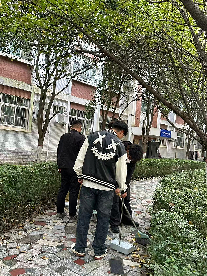 活动筹备阶段,雒鹏翔老师精准划分清扫区域、细化劳动分工,明确垃圾分类标准及安全操作规范,为活动高效有序开展筑牢基础。实践过程中,师生志愿者分工协作、默契联动:清扫组手持扫帚与簸箕,对路面落叶、纸屑等杂物进行全方位清理,攻克卫生死角;拾捡组携夹子、垃圾袋,重点清理草丛、台阶缝隙等徒手难及区域的垃圾,并严格落实垃圾分类投放要求;擦拭组主动清洁公共座椅、宣传栏表面灰尘,让公共设施重焕洁净。