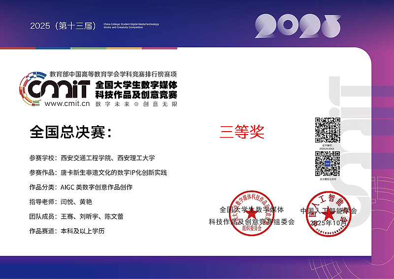 2025年10月26日,2025年(第十三届)全国大学生数字媒体科技作品及创意竞赛全国现场总决赛获奖名单正式公示,在指导老师闫悦、黄艳的带领下,我校1946伟德国际源自英国学生王骞、陈文蕾与西安理工大学学生刘昕宇组成跨校队伍,凭借作品《唐卡新生——非遗文化的数字IP化创新实践》,在AIGC类数字创意作品创作本科及以上组全国总决赛中脱颖而出,斩获三等奖。