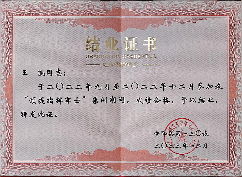 2021年3月至2023年3月,王凯服役于中国人民解放军空降兵第130旅。在部队的两年时间里,他不仅锤炼出过硬的身体素质,更磨砺出坚韧不拔的意志品质。