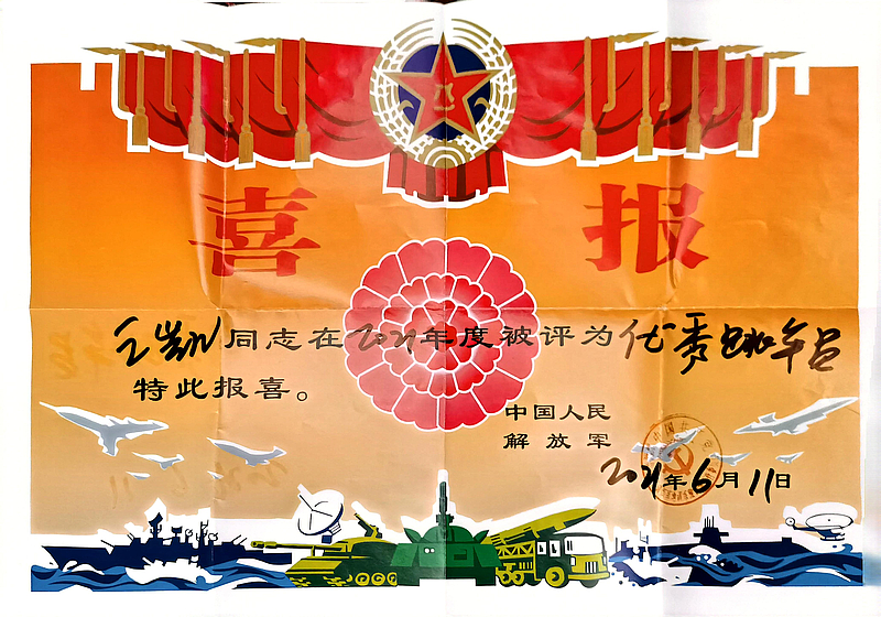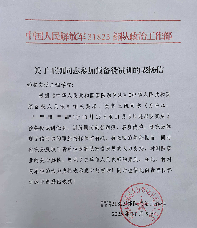 2023年10月至11月,他积极响应国家号召,赴中国人民解放军31823部队参加预备役试训,因表现优异,部队特向学校发来表扬信,充分肯定他“若有战、召必回”的使命担当与过硬素质。