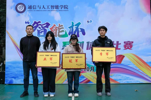 闭幕式由充满活力的啦啦操表演拉开序幕,学院团总支书记薛华老师首先进行赛事回顾,详细汇报了各项目比赛结果及获奖情况。一个个荣誉的背后,是选手们的刻苦训练与不懈坚持。随后进入颁奖环节,现场首先颁发优秀运动员奖,表彰在赛事中展现卓越竞技风采的个人;紧接着颁发优秀裁判员奖,以程稼斌为代表的7位裁判员尽职尽责,为比赛的公平公正保驾护航,这份荣誉实至名归;最后颁发集体项目奖项,其中篮球赛获得冠军的是通信工程2502班,获得亚军的是通信工程2501班和通信工程2503班,获得季军的是通信工程25z1班;趣味运动会则由通信工程专业摘得桂冠,大数据管理与应用专业荣获第二名,物联网工程专业获得第三名。与会领导依次为获奖个人与集体颁发荣誉奖项,现场掌声雷动,既是对获奖者的热烈祝贺,也是对所有参赛者全力以赴的充分肯定。