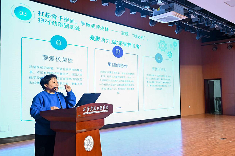 针对“如何战”,张雯雯结合《本科教学工作合格评估知识手册》,为全体骨干制定了明确的“战时行为准则”,包括课堂表现、文明素养、宿舍建设、校情认知、活动参与等五个方面的“正面清单”必须做到,以及一系列“负面清单”绝对禁止。她要求骨干们不仅要自身成为“迎评明白人”和“行为示范者”,更要读懂学校的奋斗历史、精神文化和办学实力,将“自强不息,修德载物”的校训、“道钉精神”以及“自律、勤奋、精业、敦行”的学风内化于心、外化于行,展现出真正的自信与自豪。